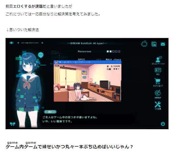 在月初的时候,他曾因为本游戏主体是画画AI,内容不够色而感到苦恼,但很快他就想到了非常逆天的解决方案: