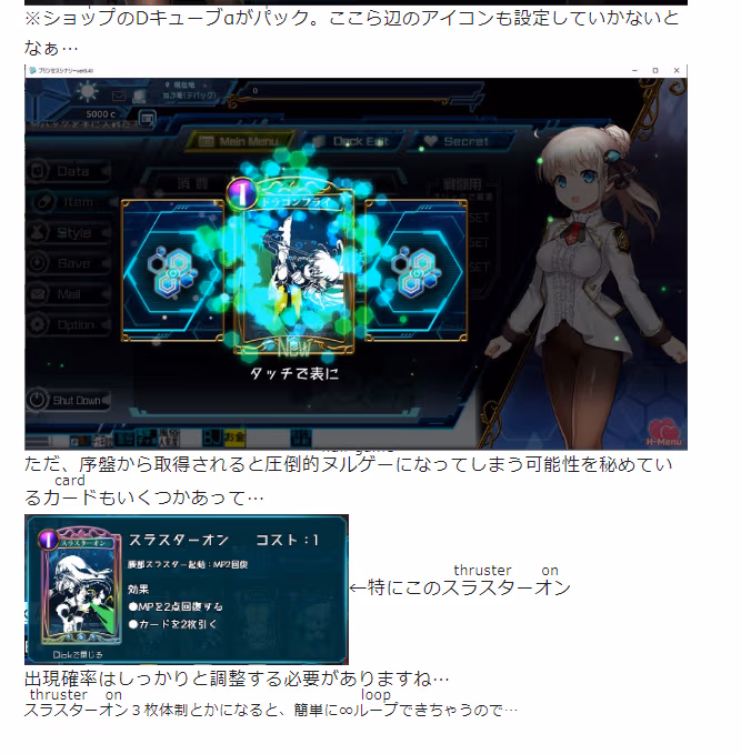 看见这个系统,想必大部分人的DNA是不是都动了,没错,这正是端音乱希老师与Ixy老师合作的社团【ShiBoo!!】旗下的游戏【魔法闘姫フロスティア(魔法斗姬芙洛蒂娅)】的地下城探索系统。相对于其他传统的探索型RPG,这种模式通过大幅度减少迷宫地图和隐藏道具的数量,将事件约等于两点一线地连接在一起,保证了每一个玩家都能顺利地推进剧情。当然,无论什么东西都是有两面的,使用这种地下城探索模式,两点一线地推进剧情,就注定了本作在战斗探索阶段比起传统的地图探索模式,会相对来说缺少支线剧情。总的来说,传统的地图探索模式与这次的地下城探索模式各有千秋,但结合本次游戏的单主线少支线的剧情架构来说,地下城探索模式可能是一种更好的选择。
