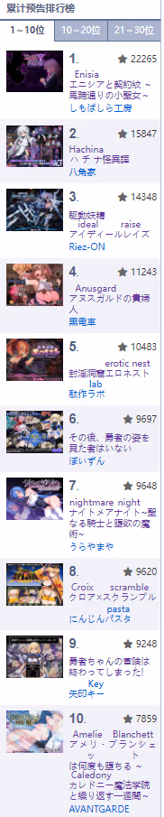 顺便一提,他为上架预告贩卖作品后得到的大量收藏表示感谢,前十除了黑电车(每次都忘了写他)第十的NTR作品(这个真不熟)和不在本报介绍范围内的星名老师,其余人全都有所涉及,可见本报含金量(x)