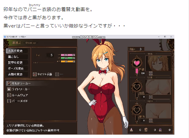 第六作正在缓慢更新中,本次追加了服装更换系统和一件红色兔女郎装,并且尝试以NPC视点画了新的CG